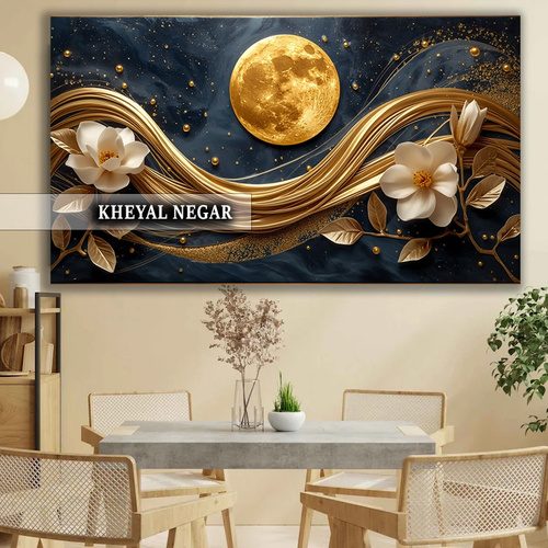 این تابلوی منحصر به فرد، شما را به دنیای زیبایی و شکوه دعوت میکند. طراحی شگفتانگیز آن با ترکیبی از طلای درخشان، گلهای لطیف و ماه کامل، احساسی از آرامش و زیبایی را به فضا میآورد.